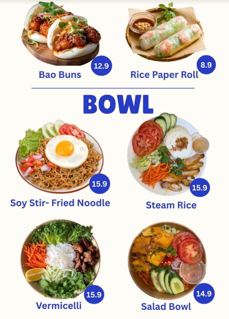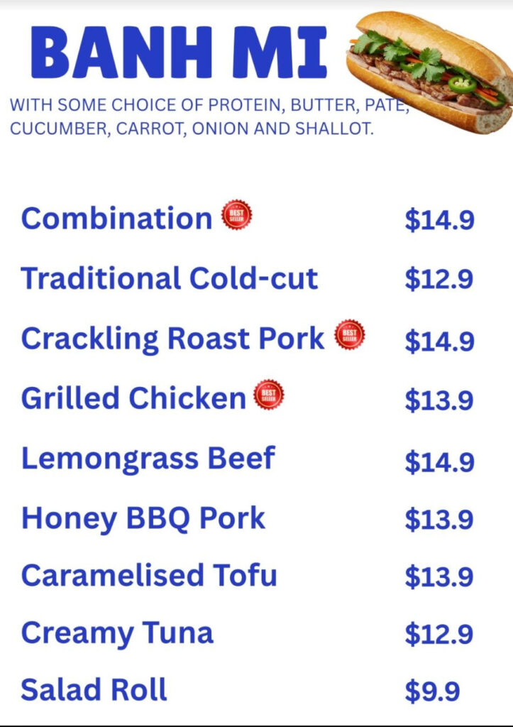 The menu blends traditional Vietnamese favourites with modern café drinks. Guests can enjoy crispy, flavourful bánh mì filled with options like crackling roast pork, grilled chicken, lemongrass beef or caramelised tofu. For something lighter, the menu also features fresh rice paper rolls, bao buns, vermicelli bowls, and stir-fried noodles, all prepared with crisp vegetables, herbs and authentic sauces.